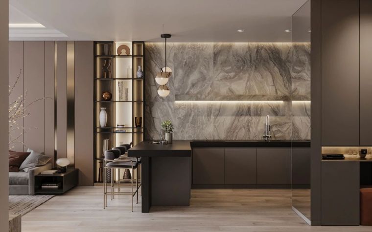 业主是一位年轻的90后,设计师以现代简约为基础,简洁流畅,灰白的色调与木纹的柔软细腻相结合,丰富的纹理营造了空间的质感,塑造了惬意与舒适的居住空间。客厅是整个家居空间中极具品味的地方之一,空间有着非常利落的线条,精美的摆件造型伴随着柔和的灯光,显得熠熠生辉。L型的橱柜布局,灰色大理石背景,衬以纯黑的台面,餐桌和柜台一体,圆形吊灯的装饰,使整个用餐氛围变得唯美而雅致。卧室是一方沉静的美,呈现出深邃、清雅和悠然的艺术气息。