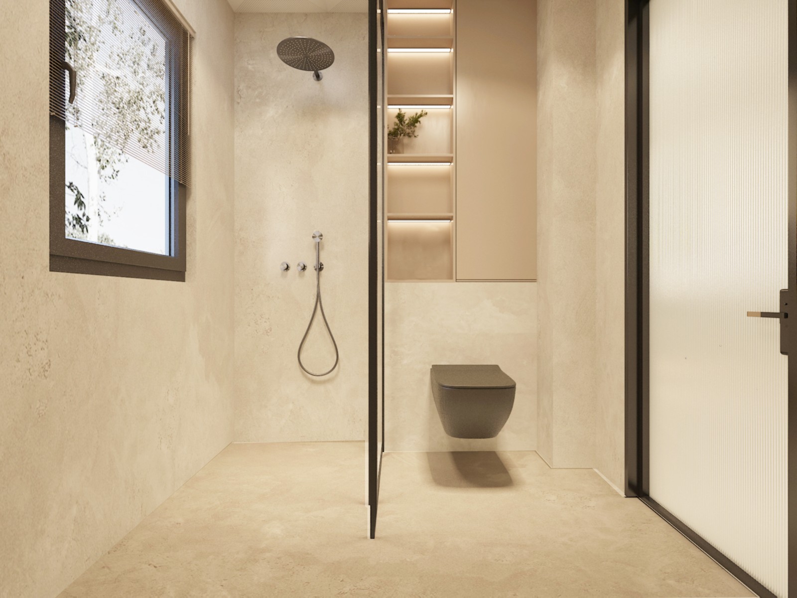 设计说明:现代生活的信息爆炸,物欲横流。大环境下人们压力倍增,容易焦虑,疲惫。流行的装饰风格在一定程度上折射着当下人们心境上的需求。也是在这样的情况下,和本方案的业主交谈中捕捉到这样的信息,给新婚夫妻两人推荐做诧寂风,很感谢他们的接受和喜欢。在设计中我们主要运用弧形的元素,打破原户型中空间相对局促,直线条多而刚硬的氛围。先让空间柔下来。拆掉多余墙体,让书房和客餐厅做联动,同时不要电视,在电视墙上做玻璃砖装饰,家中通透开敞,降低娱乐性让生活慢下来。整体用暖色调,兼具明度,无主灯顶面和局部立体光源的丰富,在主要材质微水泥和柔光砖的空间中柔和非常,让我们平静下来。方案设计感十足的同时当然也不会忽略房屋的主体,功能性。具有现代极简的轻省又有东方禅意幽静的诧寂,成全我们在生存工作的压力之余,回归生活本身,回归自己!